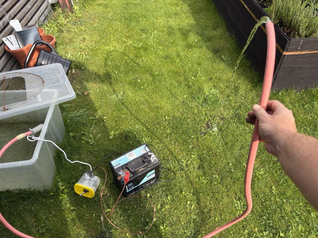 En portabel 12V-pump löser detta elegant. Du kan ta med pumpen till vilket vattenkärl som helst, koppla in den och pumpa vattnet dit det behövs.
